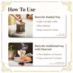 On an electric burner, the bakhoor will last for approx 10 minutes. The bakhoor will last for 15 minutes if burned on charcoal. With Dukhni's Smokeless Candle Bakhoor Burner, the bakhoor lasts for 3 to 3.5 hours.