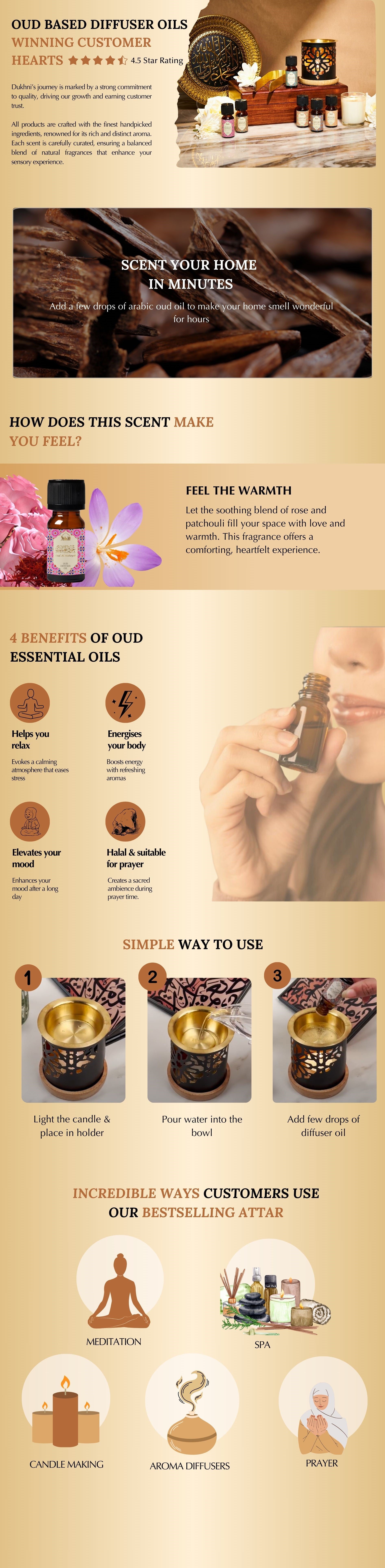 How to use: Add 8-10 drops of the oud oil to water and burn it using a candle based or electronic diffuser. You can add more oil to your diffuser for a stronger scent or if burning in a very large area