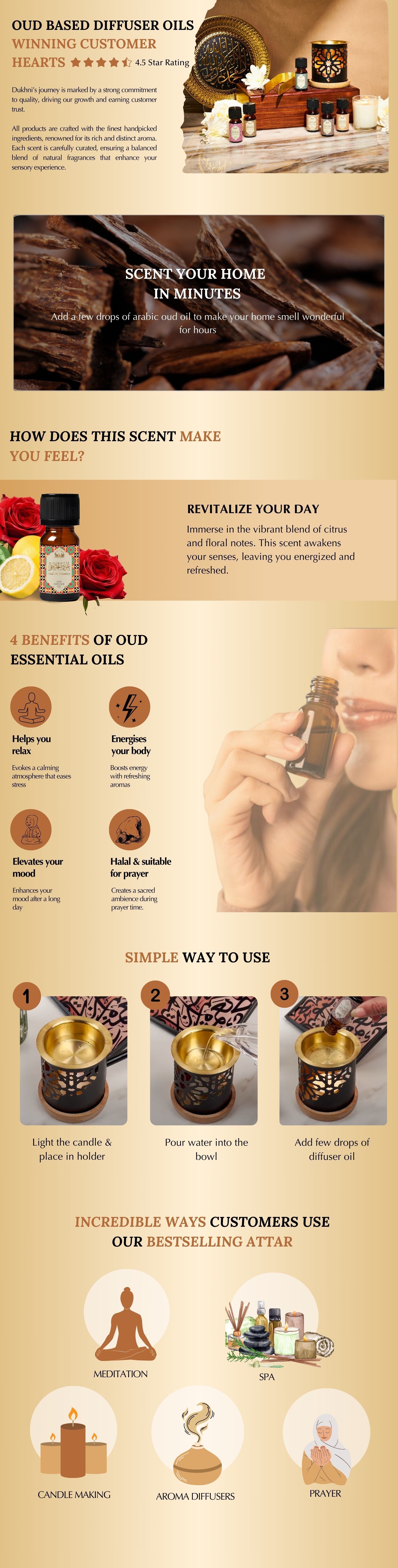 How to use: Add 8-10 drops of the oud oil to water and burn it using a candle based or electronic diffuser. You can add more oil to your diffuser for a stronger scent or if burning in a very large area