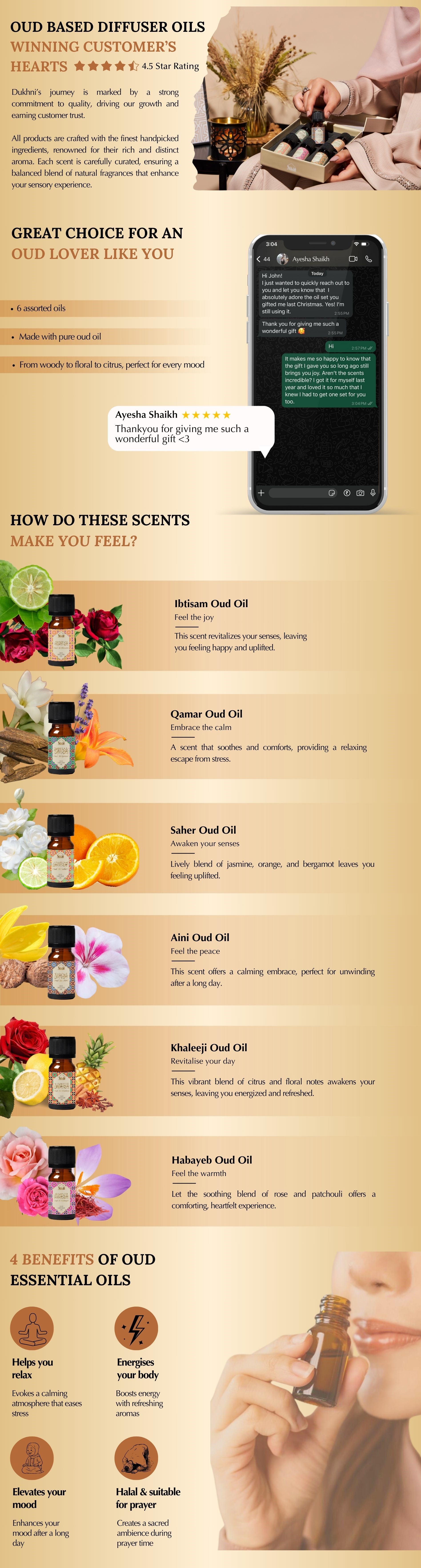 FRAGRANCE DESCRIPTION: Dukhni Oud Diffuser Oil set is carefully curated to include a wide assortment of fragrances. With floral scents like Oud al Ibtisam, Oud al Habayeb and Oud al Qamar to rich, deep and woody scents like Oud ya Aini and Oud al Khaleeji and a sweet scent like Oud al Saher