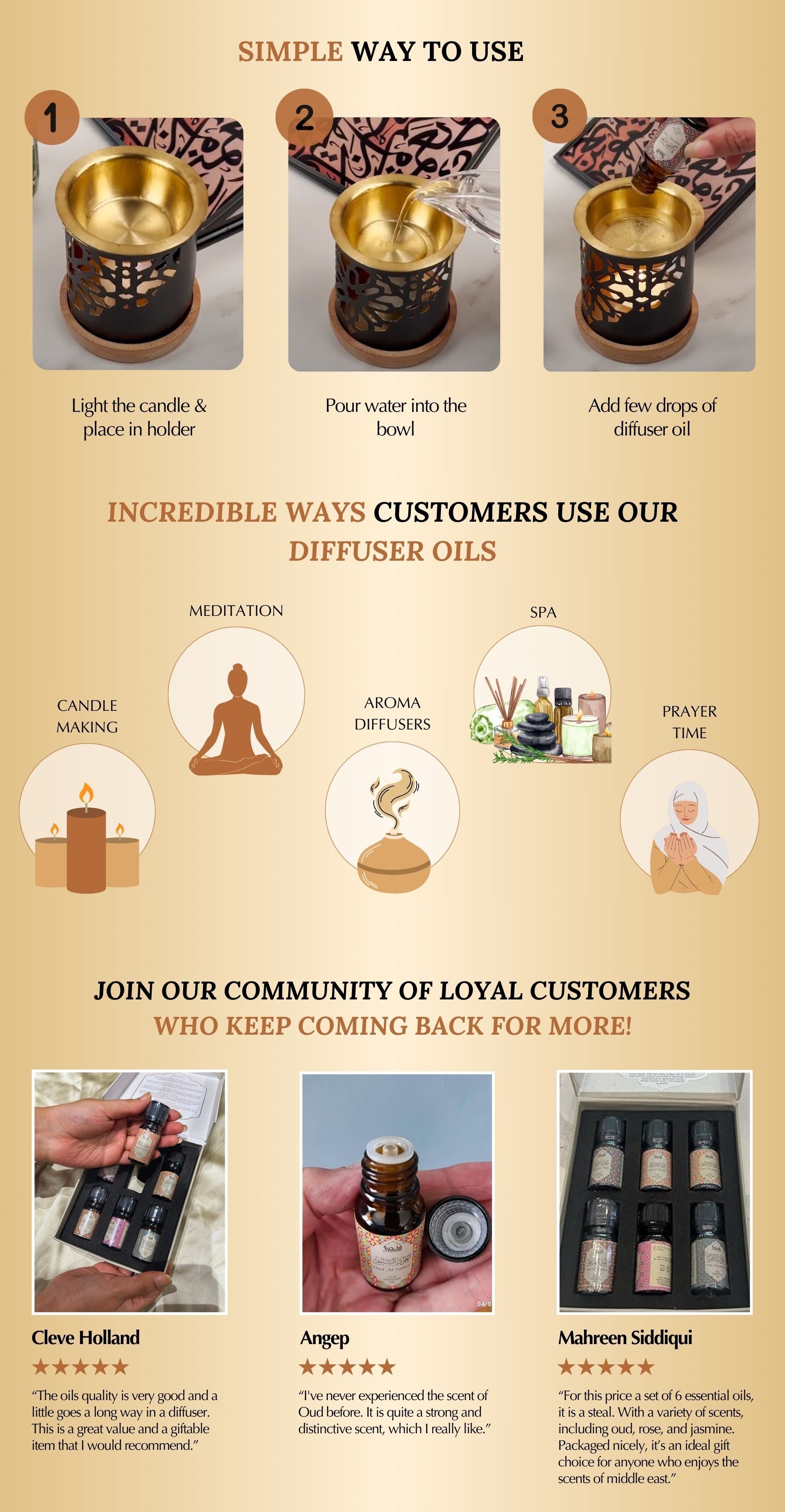 Experience luxury aromatherapy with our pure Oud diffuser oils. Add to a diffuser oil burner or a humidifier to create a serene, mosque-like atmosphere in your home—an amazing gift for any occasion.