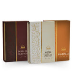 CONTENTS: 1 x 6ml bottle of Dehn Al Oud attar oil. 1 x 6ml bottle of Misk Rijali attar oil. 1 x 6ml bottle of Sandalia attar oil