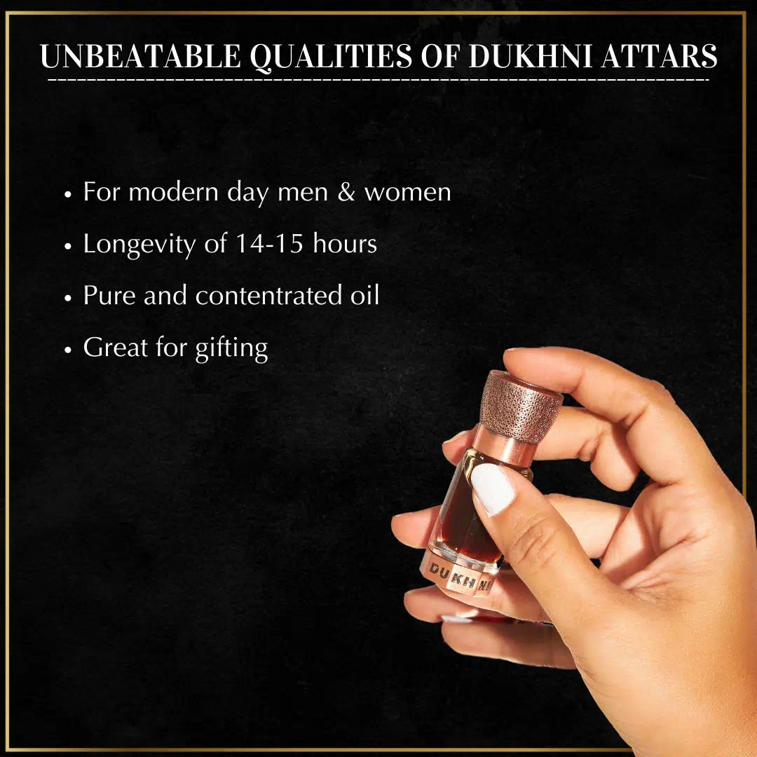 ABOUT DUKHNI ATTARS: Dukhni Arabic Attar Oils are luxury fragrances made using the finest quality, sustainably-sourced natural ingredients. Just a dab goes a long way and the size of the bottle makes it convenient and easy to carry around and apply. Our essential oil blends are crafted to create unique and evocative scents, perfect for gifting or personal use. Our products are compellingly precious and personal, translating memories and emotions into unforgettable experiences