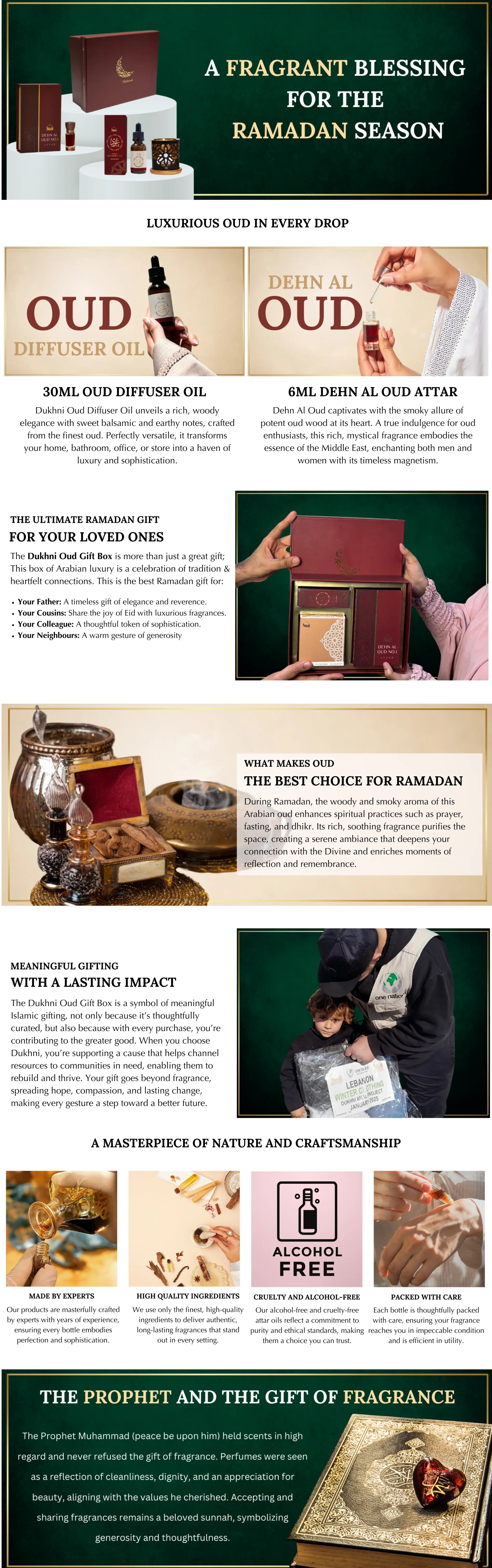 CONTENTS: 30ml of Oud Diffuser Oil, 6ml premium oud attar Dehn Al Oud, a Wrought Iron Burner, Brass Bowl, Wooden Coaster, Tea Light Candle
