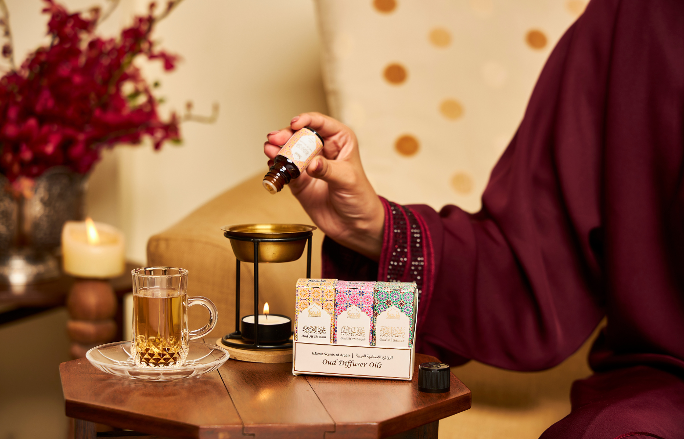 Scent your space with our Oud Diffuser Oils and Oil Burner combo. This elegant set includes three 10ml Arabic diffuser oils, a wrought iron burner, brass bowl, wooden coaster, and tea light candle—perfect for gifting on any occasion. Bring warmth, tranquility, and a luxurious Arabic aroma to your home while enjoying versatile aromatherapy for relaxation, meditation, or daily indulgence.