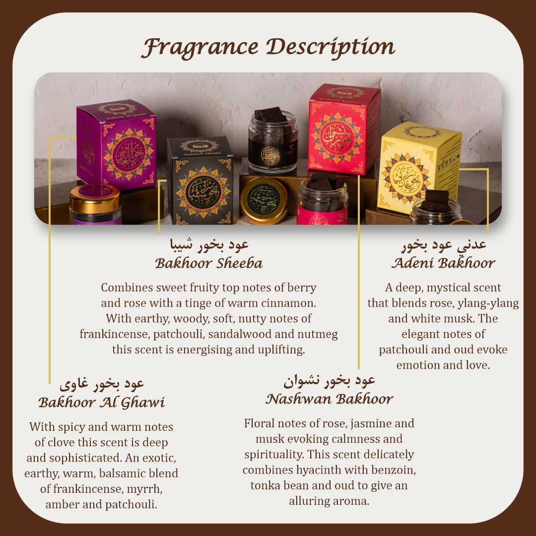 Adeni Bakhoor: Warm, mystical aroma combining rose, ylang-ylang, and white musk for an emotional, romantic scent.