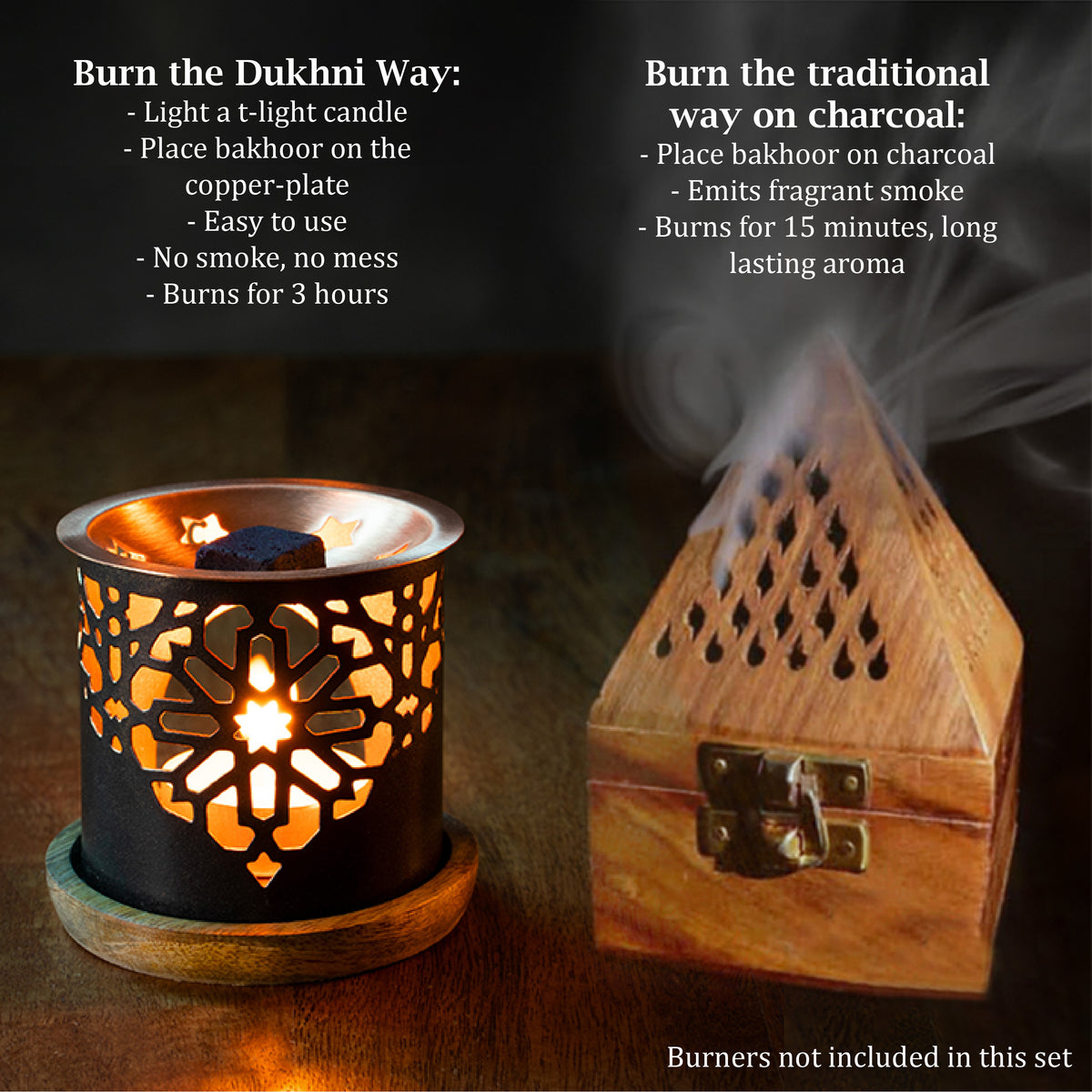 Place a bakhoor piece on a heated charcoal disc, electric burner, or Dukhni candle burner. Allow the aroma to gently diffuse, filling your space with luxurious fragrance. Use daily or for special occasions to create a serene, welcoming environment.