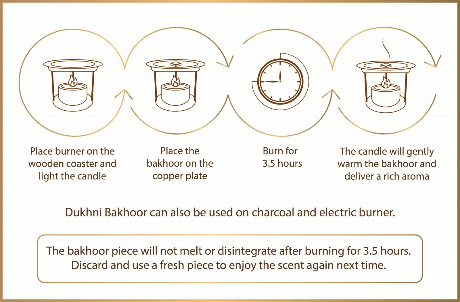 Dukhni bakhoor can be burned 3 ways- on the Dukhni smokeless burner, on charcoal and on any electric burner. Please follow all safety precautions while burning bakhoor.