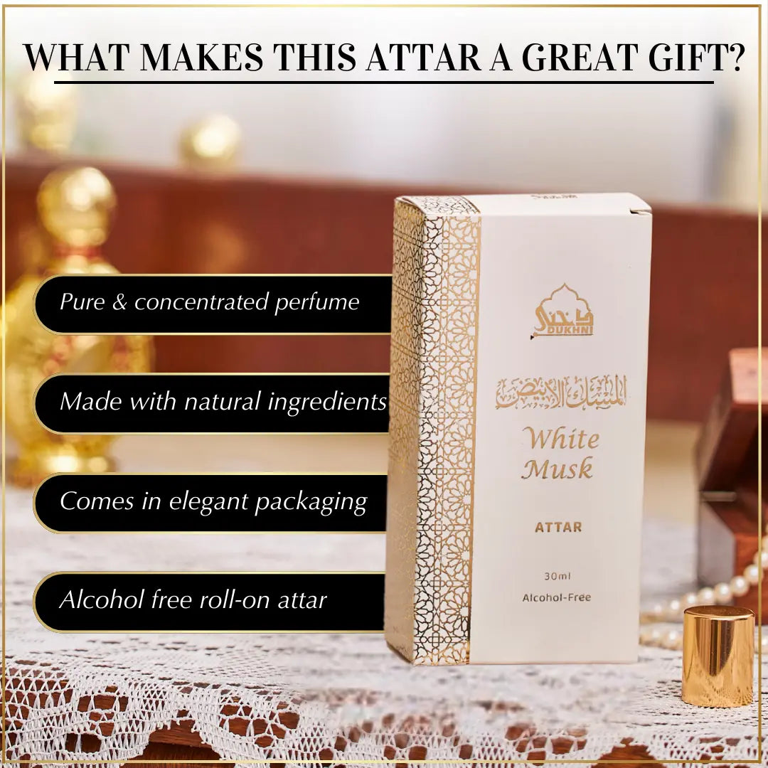 Experience all-day freshness with Dukhni’s 30ml White Musk Attar—a premium, alcohol-free perfume oil crafted for lovers of clean, understated scents. Its smooth roll-on format makes it effortless to wear, while the elegant packaging ensures it’s a thoughtful, ready-to-gift choice. One of our newest launches, this long-lasting attar is perfect for daily wear and offers great value with the 30ml pack.