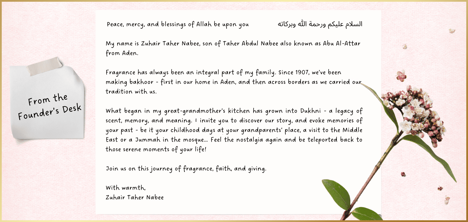 In 1979, political unrest forced the family to leave Yemen. They settled in Dubai and Saudi Arabia, carrying not only their belongings, but the legacy of bakhoor-making with them. Out of this migration, Dukhni was born - a way to preserve and share a heritage built on fragrance, faith, and fine craftsmanship.