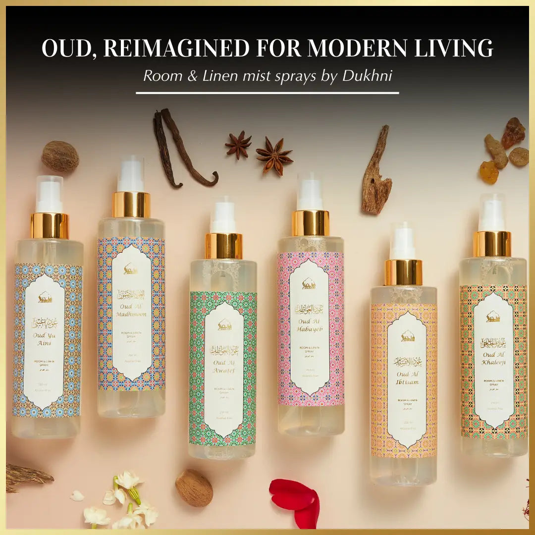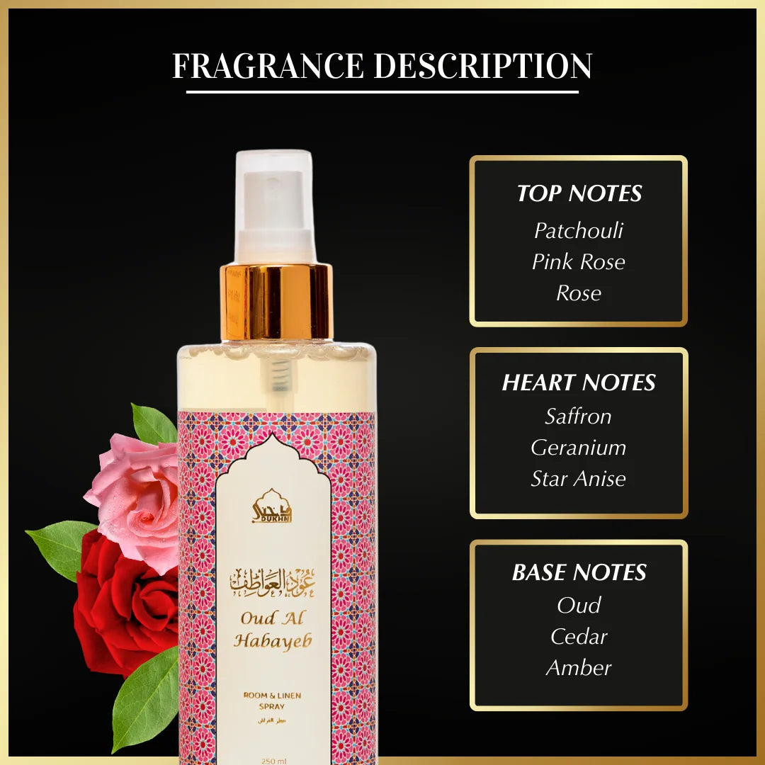 Refresh your space in just 5 minutes with our non-alcoholic Oud Al Habayeb room and linen spray. Crafted with gentle, pure ingredients, this versatile mist instantly revives your home and fabrics—leaving behind a soft, lingering aroma that feels clean, comforting, and beautifully luxurious. Safe to use around your living spaces, it’s perfect for everyday freshness as well as special moments.