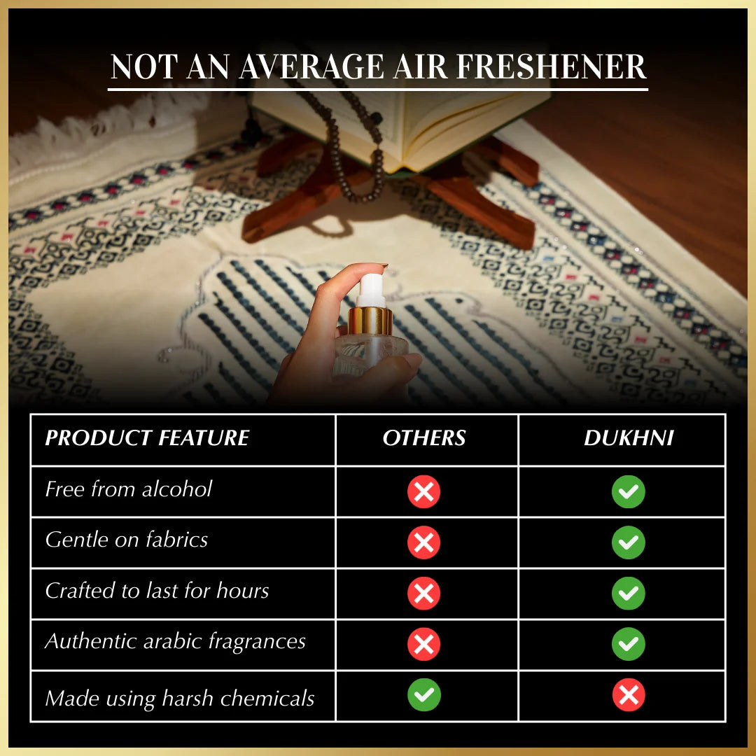 Refresh every space with the soothing scents of Arabia. After cooking, just a quick spray replaces lingering food smells with a clean, warm fragrance. In the car, it instantly freshens the air and adds a touch of luxury to your commute. During prayer, the calming aroma creates a peaceful atmosphere that helps you feel centered and connected. Even in your workspace, a light mist sets an uplifting mood, helping you stay focused and grounded throughout the day.