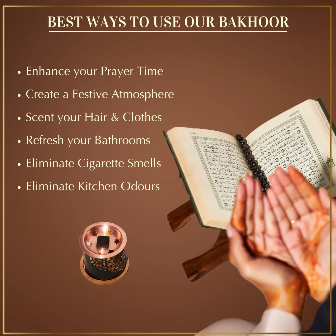 DUKHNI OUD BAKHOOR: is carefully curated to include a wide assortment of fragrances from sweet and floral to rich, deep and woody scents. A gift of discovery, our variety box is a great way for you to experience the range of Dukhni Bakhoor. The signature smoke-free bakhoor burner allows you to fragrance your home regularly without the mess or smoke and you can enjoy a long lasting aroma. Dukhni Bakhoor is ideal to light before prayer time, while reading the Quran, meditating, relaxing or after c