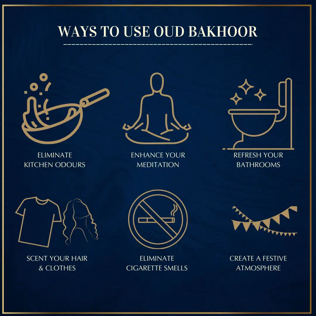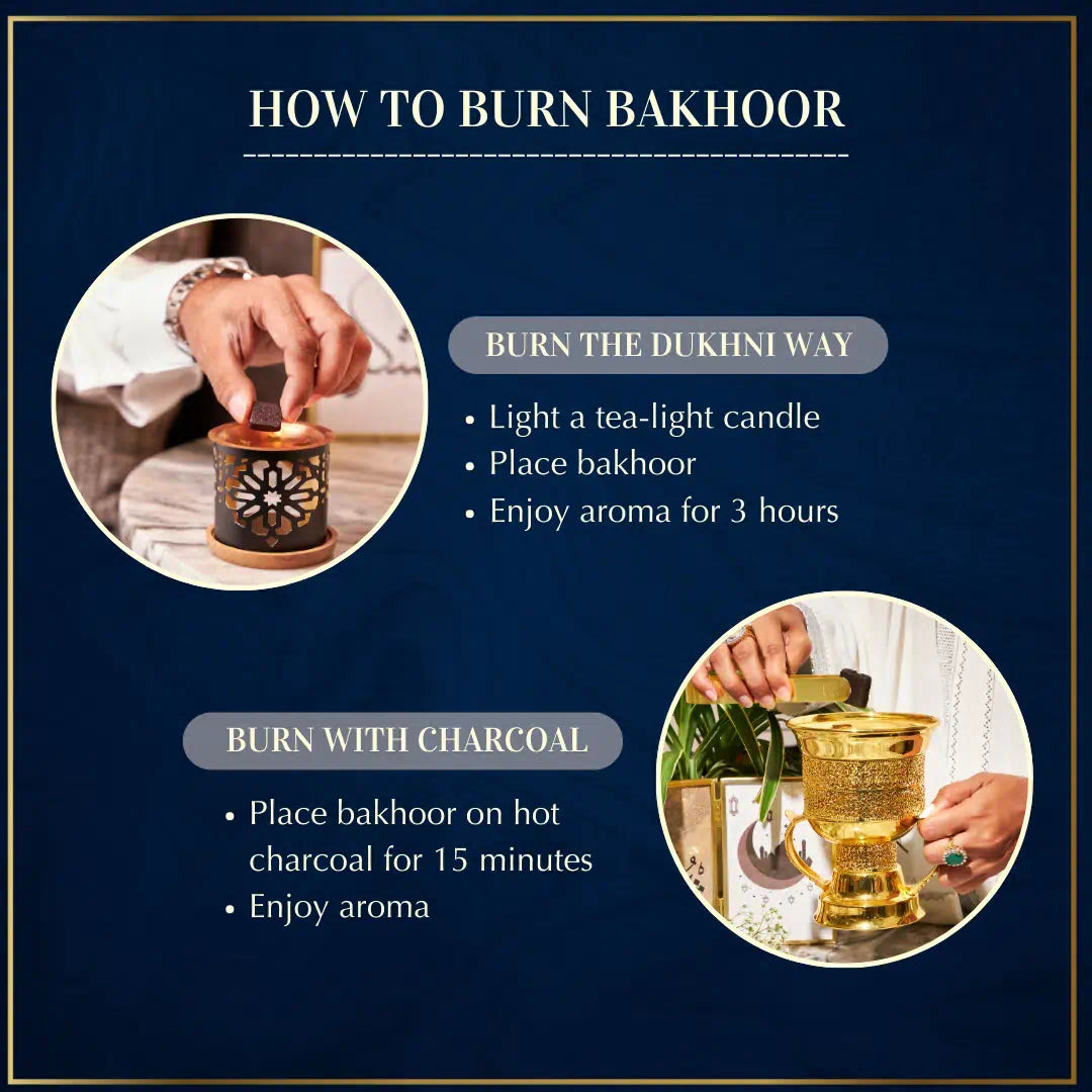 Light a charcoal disc or switch on an electric or Dukhni candle burner. Once heated, place one piece of bakhoor on the burner and allow the fragrant smoke to gently diffuse through the room. One piece is enough to scent an entire space and is perfect for prayer, Quran reading, meditation, or refreshing your home before guests arrive.